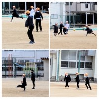 日本の伝統的なお正月あそびのコマ回し・はねつき・ケン玉・ダルマ落とし等を体育館で、運動場を使って凧上げを楽しみました。