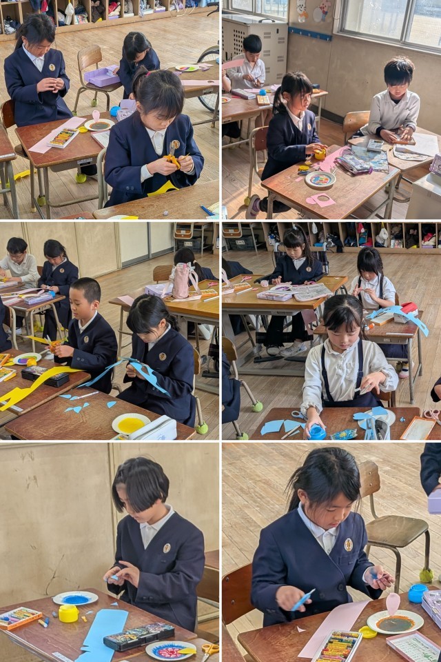 ペーパープレートにクレヨンで色を塗って花をつくっています。