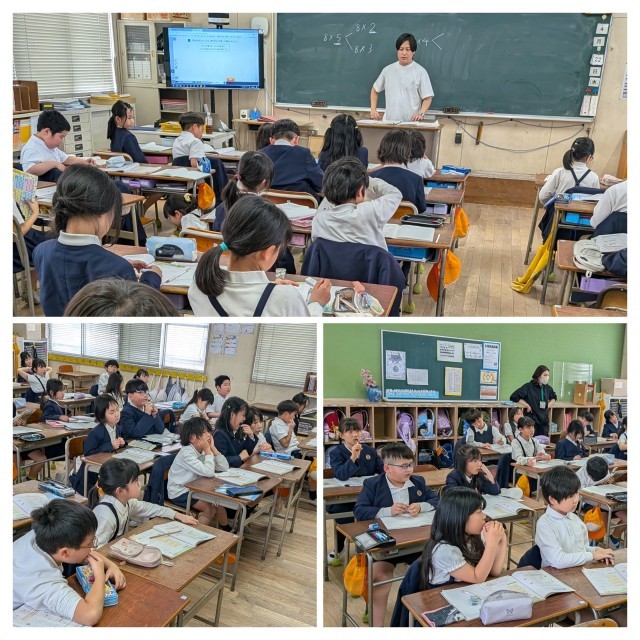掛け算の性質を復習しています。教科書を参考に、ノートに集中して問題に取り組んでいました。