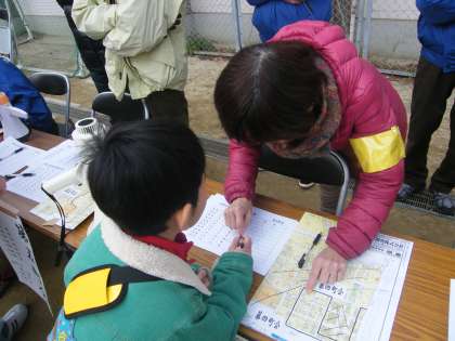 警報解除とともに、運動場に降りてきて、居住地ごとの表示がされたで、地域防災委員の方が、参加者一人ずつの顔と名前、住所を確認し、「大正区詳細地図(いわゆる「町会地図」)に赤丸を入れてくださいます。