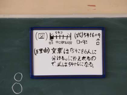 算数科の学習です。答えを出すだけでなく、考え方をペアで交流したり、ミニホワイトボードで発表したりすることで、算数的思考力を養っています。