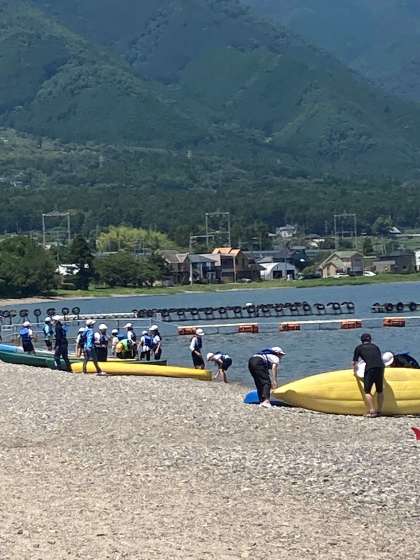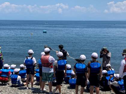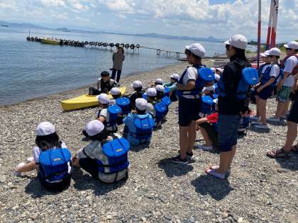 スポーツセンター到着後、すぐにライフジャケットを着けて写真撮影です。