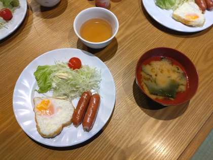 今朝の朝食は目玉焼きとウインナーです。なんと、目玉焼きはハートの形になっています! -