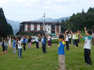 6時40分からの「朝の集い」は、宿舎の「みやま荘」を背景にラジオ体操。