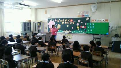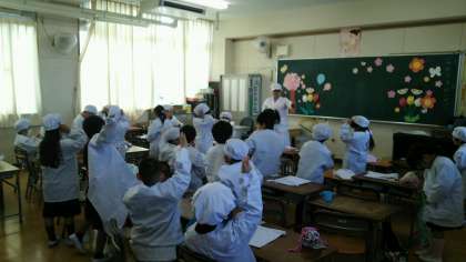 今日から、美味しい給食が始まりました。1年生にとっては、はじめての給食です。2時間目、栄養教諭の先生に給食について教えていただきました。白衣の着方や片付け方も練習しました。しばらくの間、6年生のお姉さんお兄さんが1年生の教室まで給食を運んできてくれます。