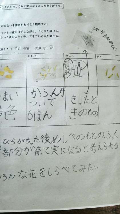 5年生の理科では、アブラナの花のしくみを学習していました。ノートに美しくまとめていました。