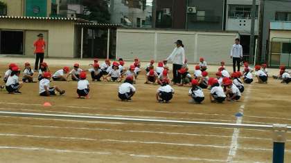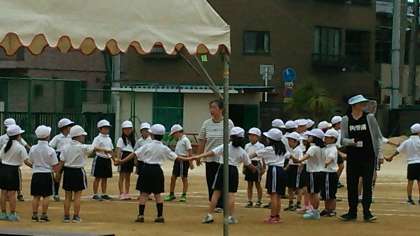 1・2年生の団体演技も、運動場での練習が始まりました。雨がふりださないうちに、さっそく場所の確認をしていました。