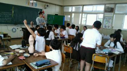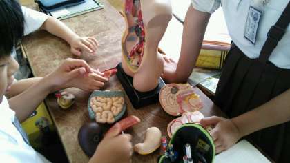 6年生の理科では、ヒトの体のしくみとはたらきについて学習していました。模型を使いグループの友だちと確認しながら取り組んでいました。