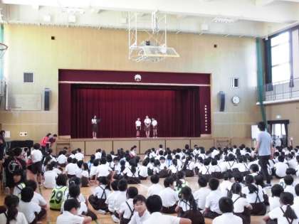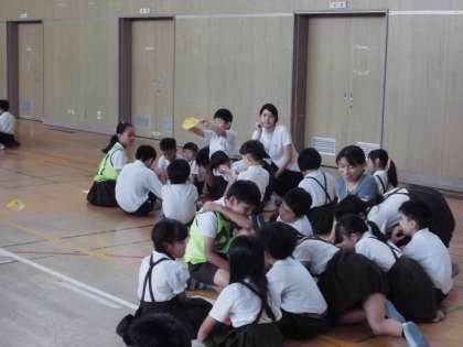 集会委員会のメンバーが言っている言葉をあてます。同時に言うのでよく耳をすましてきかないといけません。各班、聞こえてきた言葉を組み合わせて答えを考えていました。