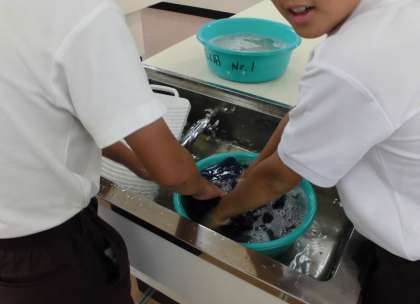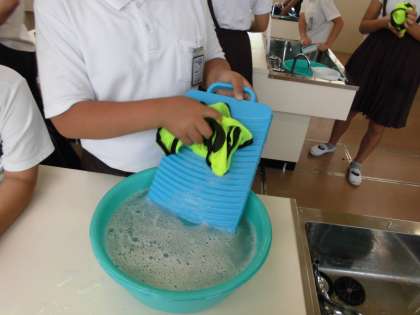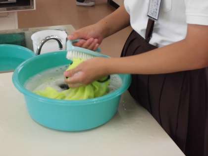 6年生の家庭科では、洗濯の学習に取り組みました。運動会で使ったゼッケンを手洗いで洗いました。洗濯板やブラシを使いながら丁寧に洗っていました。
