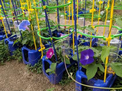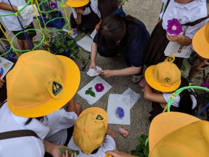 1年生が大切に育てているあさがお。つるも伸び、花が咲き始めました。あさがおの押し花をつくるようです!