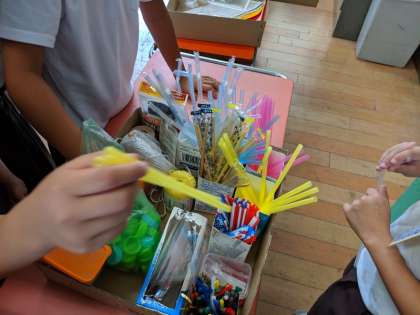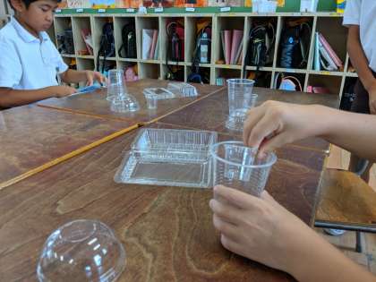 3年生の図工科では、ペットボトルやカップなど透明な材料を使って、作品づくりに取り組んでいました。色々な形の容器を目の前に、作りたいもののイメージがわいてきたようです。組み合わせを工夫しながら、楽しそうに作っていました。