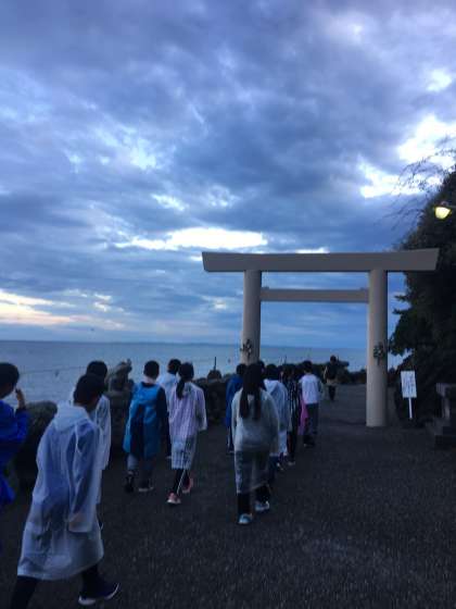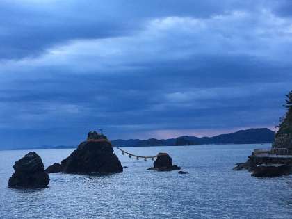 夫婦岩の後ろにはうっすらとオレンジ色に光がさしていて、さわやかな早秋の朝を感じることができました。