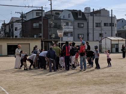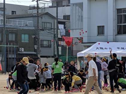 大人も子どももいっしょに、かごをめがけて玉を投げました。どのチームも、かごの中はあふれんばかりの玉でいっぱいになりました。