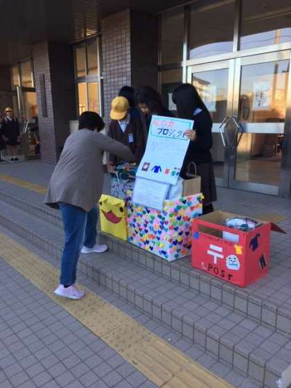 今週も6年生が正門の前で子ども服の回収を呼びかけています。