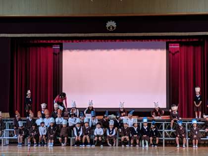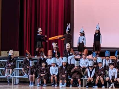 1年生の練習も、いよいよ本格的になってきました。今日は、講堂でそれぞれの役割のお面もつけて練習しました。
