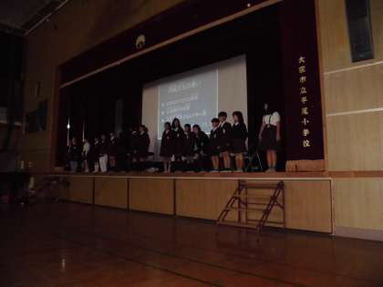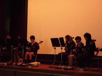はじめは、おきなわクラブの発表でした。活動紹介と三線の演奏をしました。三線は、地域の方にも教わりながら練習してきました。クラブの時間だけでなく、休み時間も練習をがんばりました。一生懸命演奏する姿が素敵でした。