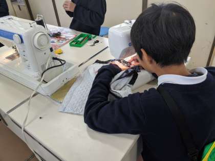 はじめてのミシン縫いも、練習するたびにどんどん上手になってきました。友だちと教え合いながら取り組んでいます。