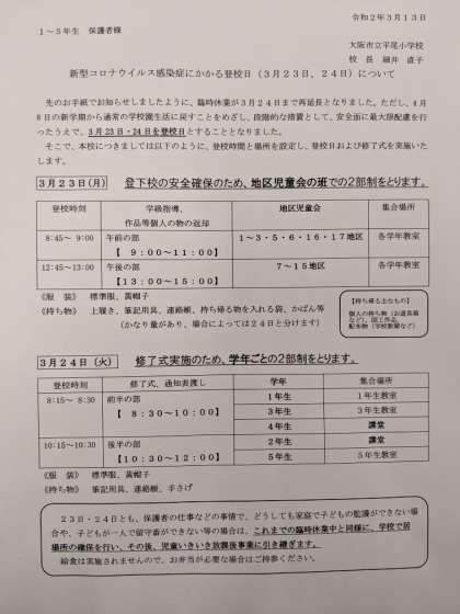 新型コロナウイルス感染症にかかる登校日(3月23日、24日)について