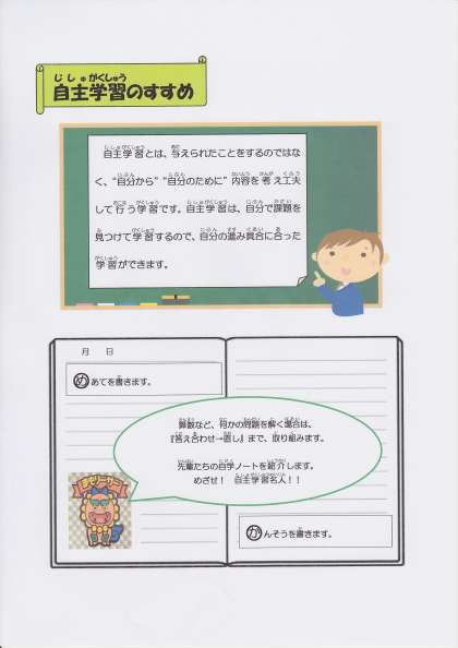 学校の宿題が全部終わったよ!というみなさんは、ぜひ、自主学習にチャレンジしてみましょう。自主学習用ノート(5ミリ方眼)を用意して取り組んでみましょう。