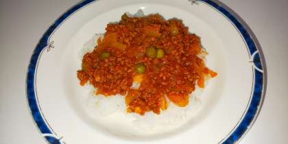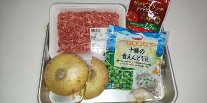 2.たまねぎが透き通ってきたら、グリンピースを加え、塩・こしょう・カレー粉・トマトピューレ・ケチャップ・ウスターソースで味付けし更に炒める。