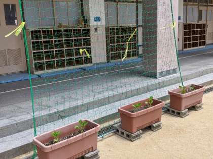 学校も、みなさんが気持ちよく過ごせるように準備を整えています。今年は、家庭科室前にグリーンカーテンをつくります。