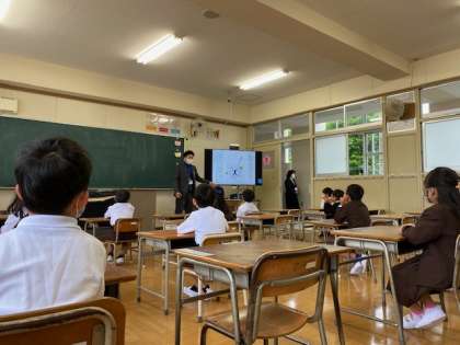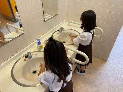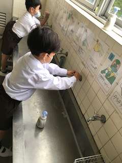 講堂で、保護者説明会をしている間、子どもたちは、がっこうたんけんをしました。教室では、「コロナウイルスってなんだろう?」の学習や手洗いの練習もしました。