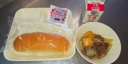 今日から、待ちに待った給食が始まりました。献立は「すき焼き煮・コッペパン・いちごジャム・牛乳」です。