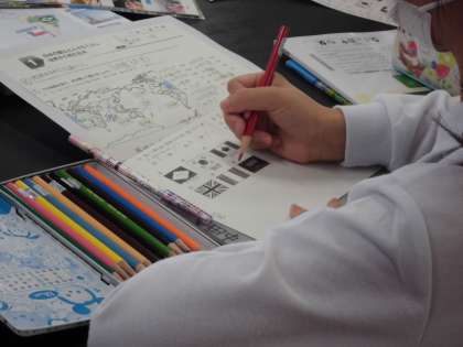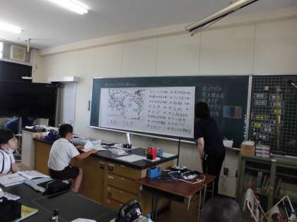 5年生の社会の時間は、「世界のすがたをしらべよう」をめあてに学習に取り組んでいました。いろいろな国の国旗も学習していました。