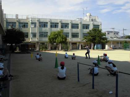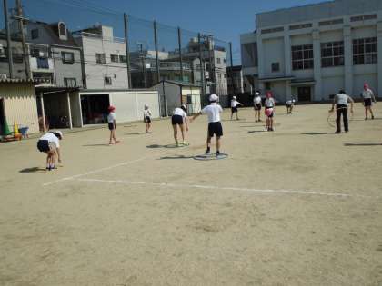 体育の学習では、友だちとの距離を保ちながらできる活動を工夫しています。フラフープをおいての大移動ゲームも盛り上がっていました。