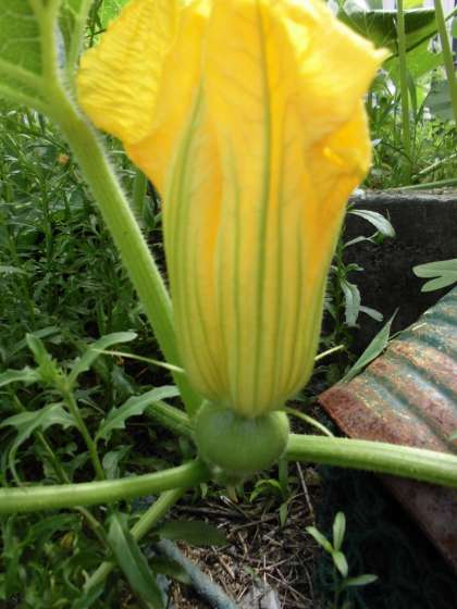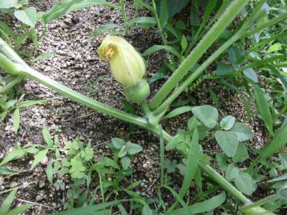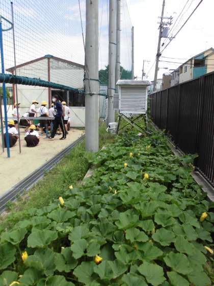 百葉箱の横には、カボチャを植えています。カボチャの赤ちゃんを見つけました!