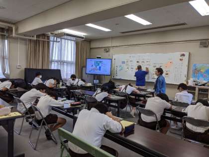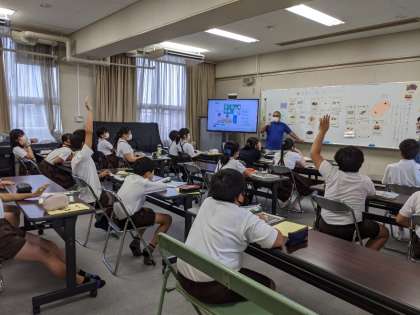 6年生の外国語では、「季節や行事の言い方を知ろう」をめあてに学習に取り組んでいました。子どもたちが目を伏せている間に、C-NETの先生が季節や行事のカードを一つ裏返します。目を開けて、裏返されたカードをあてるゲームで盛り上がっていました。