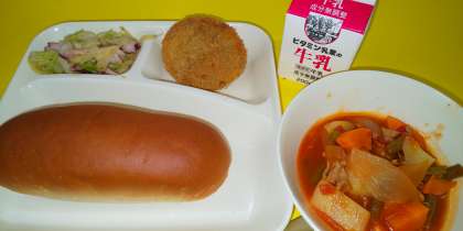 今日の給食は、「チキンレバーカツ、ケチャップ煮、たことキャベツのバジルソテー、黒糖パン、牛乳」でした。