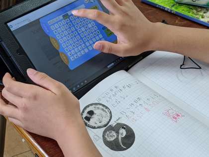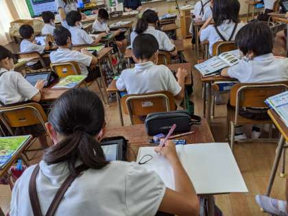 5年生の理科の学習では、メダカについての調べ学習に取り組んでいました。タブレット端末を使いながら、調べていました。