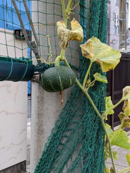 カボチャのつるは、地面だけではたりなかったようで、なんと電柱にまきつき上へ上へと伸びるほどの勢いです。そして、珍しい場所でカボチャの実をつけています!