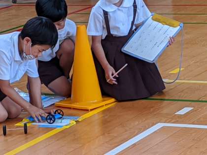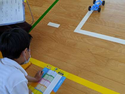 ゴムで動く車をつくって実験をしました。