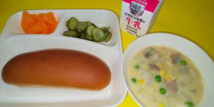 今日の給食は「コーンクリームシチュー、きゅうりのバジル風味サラダ、みかん(缶)、黒糖パン、牛乳」でした。