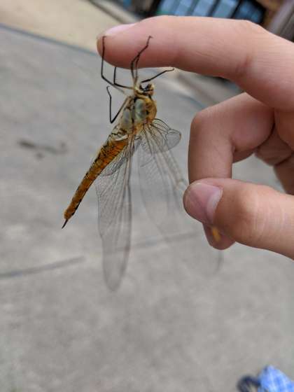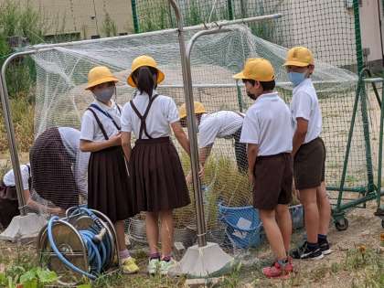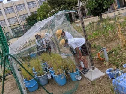5年生が、バケツ稲の観察をしたり、雑草を抜いたりしていました。最近、トンボがよくとんでいます。上手につかまえることのできた子がいました!