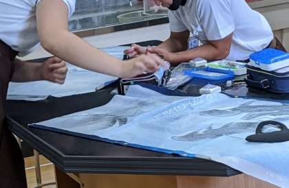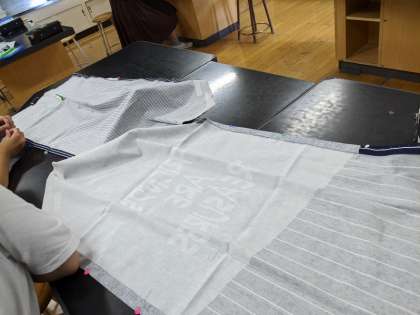 6年生の家庭科では、エプロンづくりに取り組んでいます。今日は、仮縫いをしました。