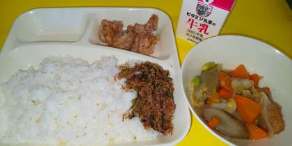今日の給食は、「鶏肉のたつたあげ、あつあげと野菜の煮物、おかかなっ葉、ごはん、牛乳」でした。