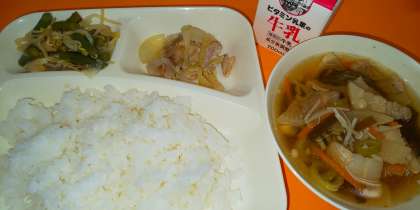 今日の給食は、「鶏肉のゆず塩焼き、ソーキ汁、キャベツとさんどまめのサラダ、ごはん、牛乳」でした。