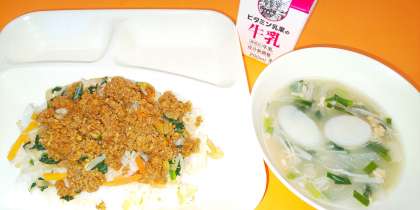 いつものビビンバは、ひき肉を炒め、砂糖・酒・濃い口しょうゆ・コチジャンで味をつけていますが、今日は、カレー粉・コチジャン・ケチャップ・カレールウの素・濃い口しょうゆで味をつけています。カレー味ということもあり、子どもたちは「おいしい!」とたくさんおかわりをしていました。