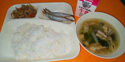今日の献立は、「焼きししゃも・五目汁・きんぴらごぼう・ごはん、牛乳」でした。