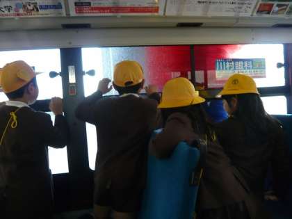 鶴町車庫では、バスの整備の様子や、洗車、料金の精算など、日頃見ることの出来ないよう所を見せて頂き、とても興味をもって見学していました。一番盛り上がったのは、なんといっても洗車!バスに乗り車内から洗車の様子を見学しましたが、洗車の機械が動くたびに「おお〜!」「すごい、きれいになってる!」と全員大興奮。とても楽しかったようです。