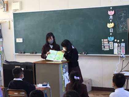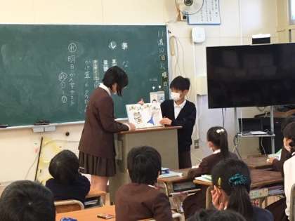毎週火曜日と金曜日の朝は、「朝読」の時間があります。今日は、図書委員のお兄さん・お姉さんが1・2年生の教室で絵本を読みました。