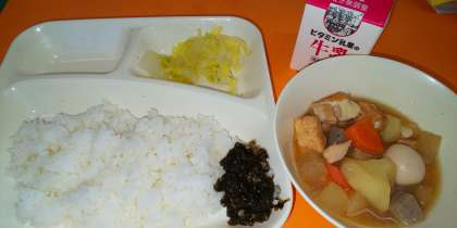 今日の給食は、「関東煮、はくさいの甘酢あえ、のりのつくだ煮、ごはん、牛乳」でした。のりのつくだ煮は、けずりぶしでとっただし汁に、砂糖・料理酒・みりん・濃い口しょうゆ・しいたけの戻し汁を加えて、煮たてたところに、しいたけを入れます。しいたけが煮えたら、きざみのりを加えて、十分に煮詰めて作ります。ごはんに合う一品です。