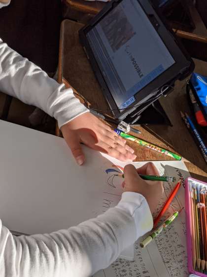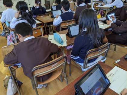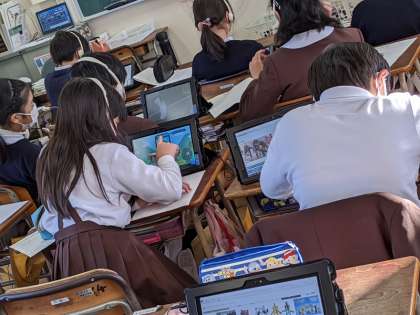 3年生の総合の学習では、パラリンピックについての調べ学習をしています。一人一台ずつタブレット端末を活用しながら取り組んでいます。