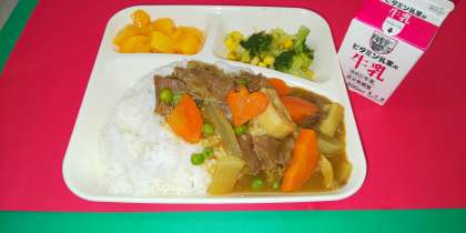 今日の給食は、「冬野菜のカレーライス、ブロッコリーとコーンのサラダ、黄桃(かんづめ)、牛乳」でした。