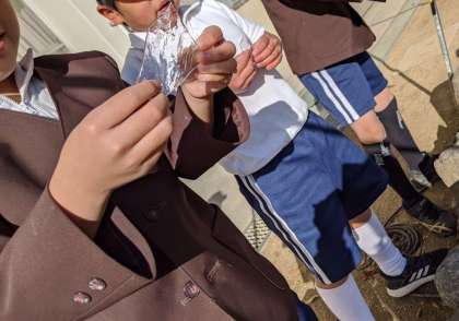 池にはった氷を見つけたり、午後からは雪が降ったりして、子どもたちは大喜びでした。