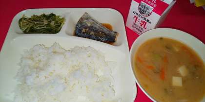今日の給食は、「さごしのしょうゆだれかけ、みそ汁、みずなの煮びたし、ごはん、牛乳」でした。